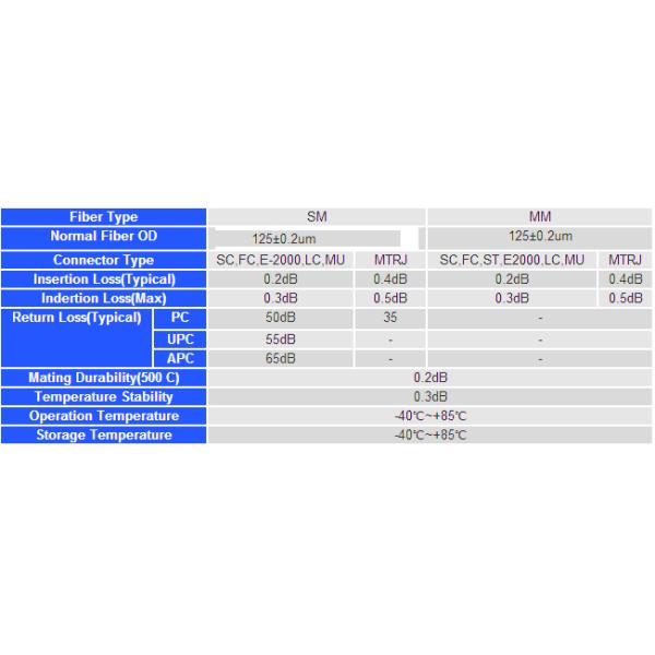 u 100% optic test: Insertion Loss: ≤0.3 (PC); ≤0.2 (APC); ≤0.2 (UPC); ≤0.3 (SPC);